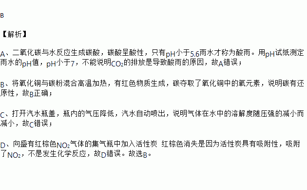B | 将氧化铜与碳粉混合高温加热 | 有红色物质生成 | 说明碳有还原性 |
