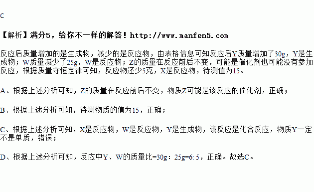 C. 物质Y一定是单质 D. 反应中Y、W的质量比为6: 5