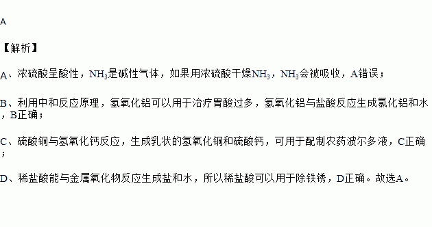 A.浓硫酸:干燥NH3 B.氢氧化铝:治疗胃酸过多