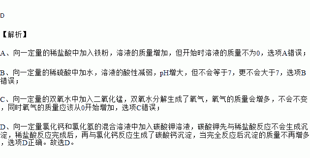 D.向一定量氯化钙和氯化氢的混合溶液中加入碳酸钾溶液![]()