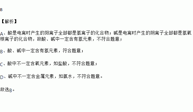 A.酸、碱中可能含有氢元素 B.酸、碱中一定含有氢元素