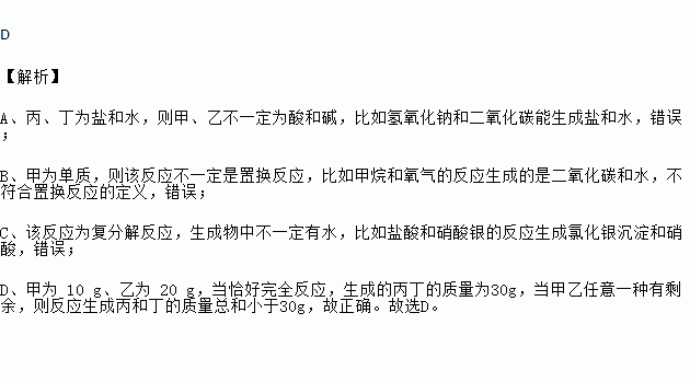 D. 若甲为 10 g、乙为 20 g,则反应生成丙和丁的质量总和一定不大于 30 g