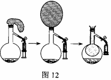 如图12所示,在蒸馏烧瓶内加适量石灰石和稀盐酸,经检验产生的气体充满烧瓶时,将一气球紧套在瓶口,气球逐渐胀大。然后打开弹簧夹,将注射器中NaOH溶液注入烧瓶并振荡,气球迅速缩小并被吸入烧瓶内。