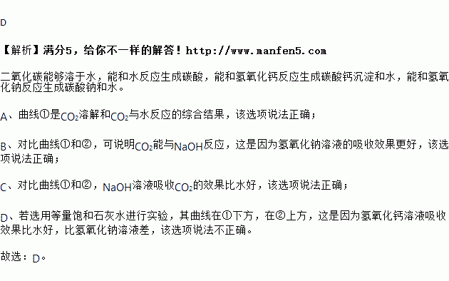 B. 对比曲线①和②,可说明CO2能与NaOH反应