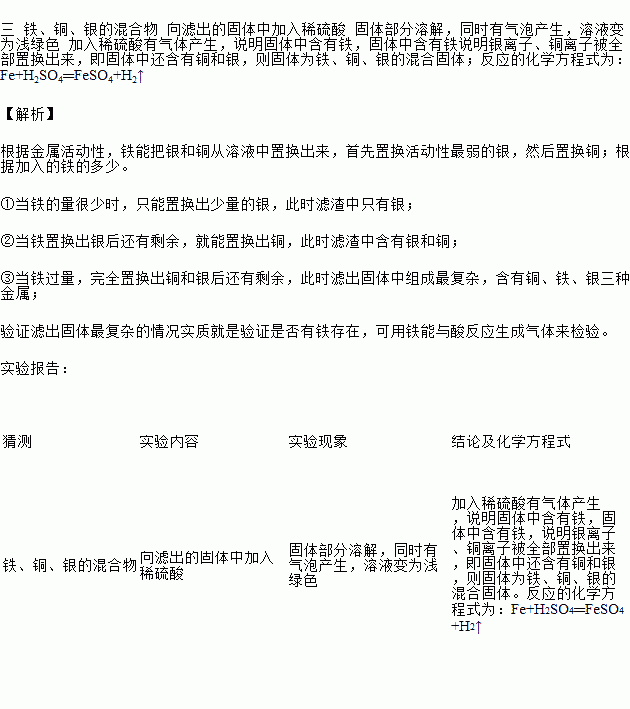 将一定量的铁粉加入到的Cu(NO3)2、AgNO3混合溶液中,充分反应后过滤,则滤出固体的组成有____种情况。请你设计实验对滤出固体中组成最复杂的情况进行验证,填写下列实验报告。