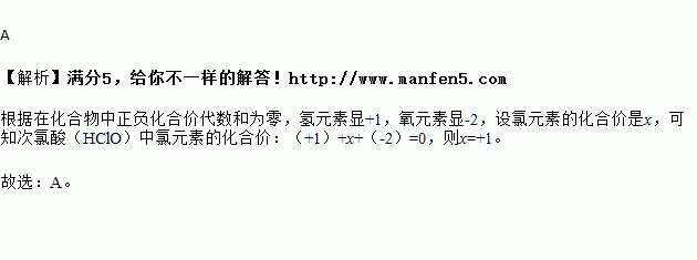 2020年初爆发的新冠肺炎肆略全球且没有特效治疗药物,作为预防为主的药物含有效成分次氯酸(HClO) , 对皮肤有刺激作用,使用不当会引起皮炎。次氯酸中(CI) 元素的化合价为( )