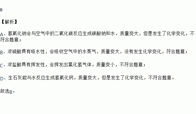 A.氢氧化钠 B.浓硫酸 C.浓盐酸 D.生石灰