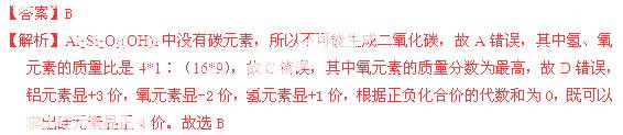 | A、它由4种元素组成 | B、其中铝元素的化合价为+3价 | C、其中氢、氧元素的质量比是4:9 | D、其中硅元素的质量分数为56% |