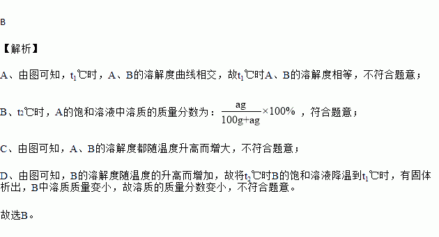 D.将t2℃时B的饱和溶液降温到t1℃时,溶液中溶质的质量分数变小了