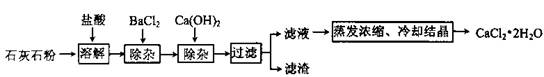 (6分)氯化钙在生活中常用作干燥剂、融雪剂,在工业上可用于制造防冻液等。某工厂以石灰石为原料生产二水化钙(CaCl2·2H2O)的流程如下。原料石灰石中含有杂质主要是MgCO3、MgSO4和Al2O3。