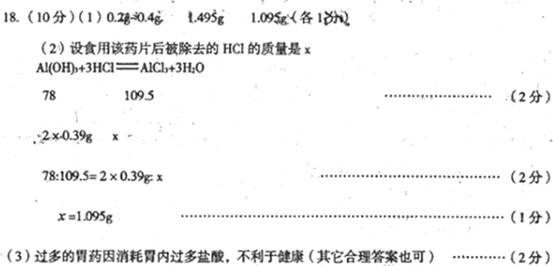 (2)医生给该患者开了一瓶胃舒平(每片含氢氧化铝0.39g),并要求病人每次服用2片,请根据化学方程式计算在食用该药片后被出去的HCl的质量是多少?(发生反应的化学方程式为Al(OH)3+3HCl==AlCl3+H2O)