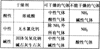 本题考查的是气体的干燥剂的问题.作为气体的干燥剂必须遵循的原则是: (1)物质具有吸水性; (2)干燥剂不与被干燥的气体发生反应. 固体氢氧化钠具有吸水性,由于固体氢氧化钠呈碱性,能与酸性气体发生反应,因此作为干燥剂时,不能用来干燥酸性的气体,但可以干燥中性的和碱性的气体[如下表所述].