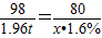 解答:解:9.8t废硫酸中含有硫酸的质量为:9.8t×20%=1.96t