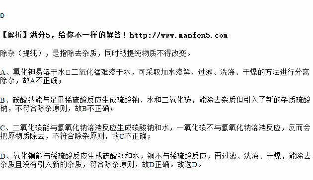 D | Cu | CuO | 加入足量稀硫酸,过滤、洗涤、干燥 |