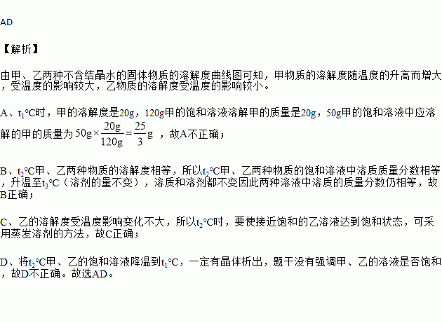 D.分别将t2℃甲、乙两种物质的溶液降温至t1℃,一定都有晶体析出