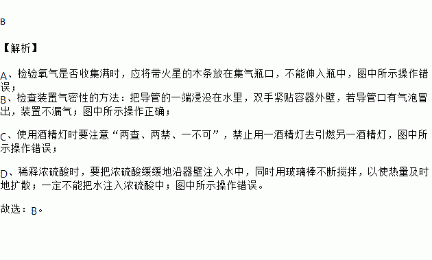 A.氧气验满 B.检查装置气密性 C.点燃酒精灯 D.稀释浓硫酸