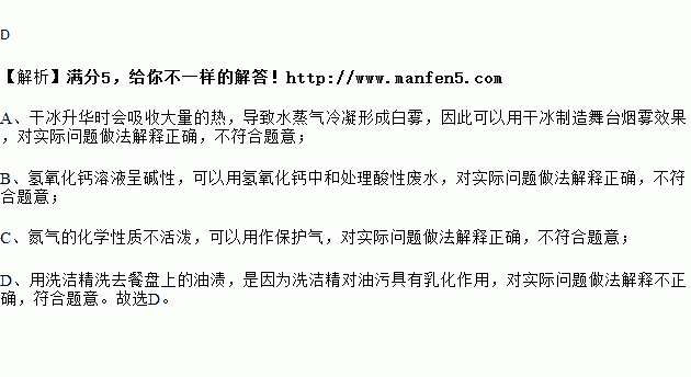 D | 用洗洁精洗去餐盘上的油渍 | 洗洁精能溶解油渍 |