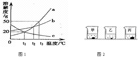 下图1是a、b、c三种固体物质的溶解度曲线,图2表示三种固体的饱和溶液在t3℃时蒸发等量的水,析出晶体的情形。