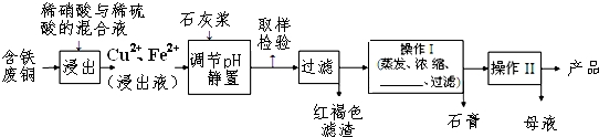 硫酸铜是一种应用极其广泛的化工原料,易溶于水而不易溶于酒精;以下是某工厂用含铁废铜为原料生产胆矾(CuSO4•5H2O)和副产物石膏(CaSO4•2H2O)的生产流程示意图: