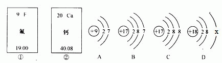 下图中的①②是氟元素、钙元素在元素周期表中的信息,A、B、C、D是四种粒子的结构示意图。