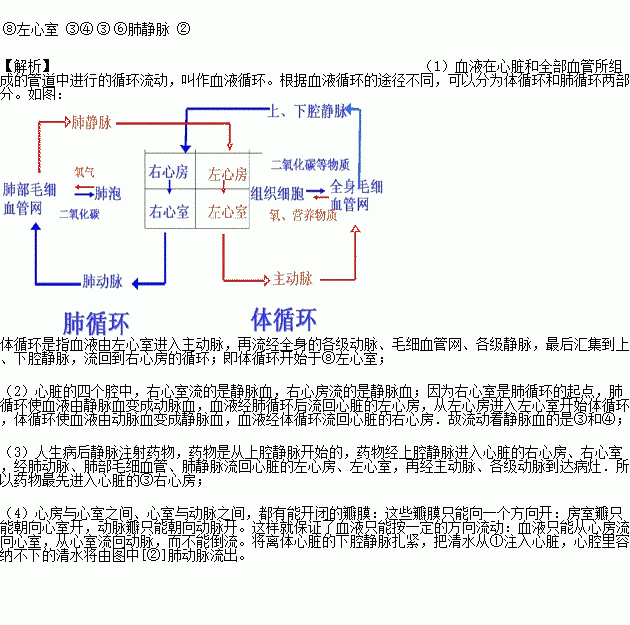 (5)将离体心脏的下腔静脉扎紧,把清水从①注入心脏,心腔里容纳不下的清水将由图中[______]肺动脉流出.
