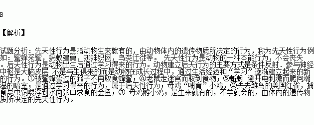①被蜜蜂蜇过的猴子不再取食蜂蜜②失去雏鸟的美国红雀,捕食昆虫饲喂浮到水面张口求食的金鱼 ③母鸡孵小鸡 ④老鼠走迷宫而取到食物 ⑤蚯蚓避开电刺激而爬向潮湿的暗室