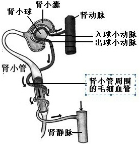 解:如图肾动脉通过入球小动脉与肾小球相连.肾小球是个血管球,它由入球小动脉分出的数十条毛细血管弯曲盘旋而成,这些毛细血管最后汇成出球小动脉.出球小动脉与肾小管周围的毛细血管相连,血液经肾小管周围毛细血管流入肾静脉.