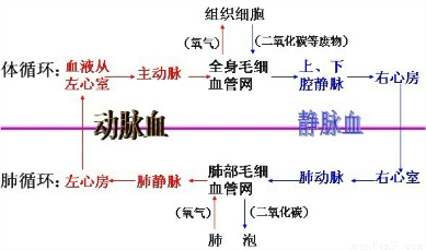 【答案】分析:血液循环是指血液在心脏和全部血管所组成的管道中进行的循环流动,根据血液流动的途径的不同,分为体循环和肺循环两部分;图示中,A、B、C、D表示心脏的四个腔:右心房、左心房、右心室、左心室.