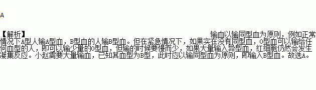 小赵是B型血,意外受伤需大量输血,应该给他输入( )