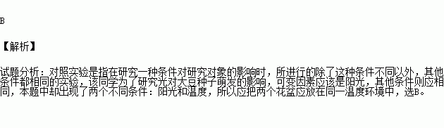 某同学探究“阳光对大豆发芽的影响”,设计如下实验:取两个相同的、装有同种等量花园土的花盆分别标号为①和②,在两个花盆中播种数量相等、饱满程度和大小相似的大豆种子,并对阳光、温度、水加以控制(如下表所示)。另一同学阅读了其设计方案后,提出下列意见,其中正确的是( )