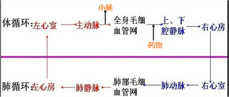 因此小丽在医院静脉注射药物后,到达小肠依次经过了体循环→肺循环→体循环→小肠.