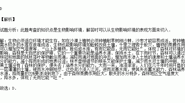 “山上多植树,胜似修水库,有雨它能吞,无雨它能吐”,这条谚语形象地说明森林对环境的作用是( )