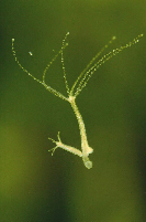 解:最常见的是褐水螅,成褐色,它的身体呈指状(圆筒型),长约1厘米.附着在物体上的一端称为基盘,上端有口,另一端有口,口的周围有5-12条细长的触手,满布刺细胞,用以捕获食饵.