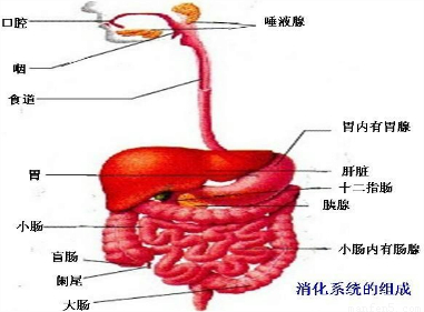 点评:此题考查了消化系统的组成:消化道和消化腺;消化道包括口腔、咽、食道、胃、小肠、大肠、肛门等器官.