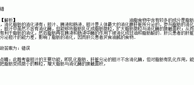 因为胆汁中含有蛋白酶,所以肝炎患者不适宜多吃油脂类食物。(_______)