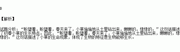 “盼望着,盼望着,春天来了,小草偷偷地从土地里钻出来,嫩嫩的,绿绿的。”这句话体现了小草