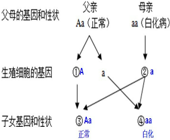 (2)写出子女的基因和性状(括号中填性状):③Aa、正常;④aa、白化.