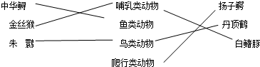 分析:扬子鳄属于爬行动物;中华鲟属于鱼类;朱鹮、丹顶鹤属于鸟类;金丝猴、白鳍豚属于哺乳动物.