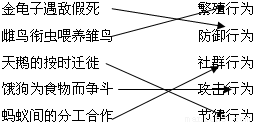 用线段连接下列动物的表现与所属的行为:①金龟子遇敌假死 A、繁殖行为