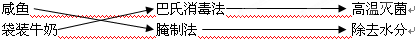 请把下列防腐方法与防腐原理用线段连接起来:咸鱼 巴氏消毒法 高温灭菌袋装牛奶 腌制法 除去水分