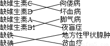 | A、缺维生素C-佝偻病 | B、缺铁-贫血 | C、缺维生素A-夜盲症 | D、缺碘-地方性甲状腺肿 |