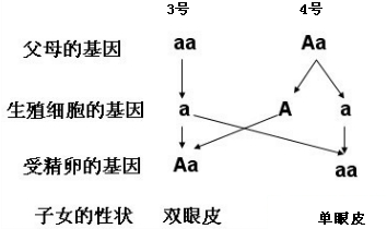 (2)由于子女中的基因是来自父母双方的,2号是单眼皮,基因组成为aa,也就是有一个a将遗传给后代,所以4号中肯定有a,又因为4号是双眼皮,是显性性状,肯定至少有一个A,所以4号的基因组成为Aa.3号和4号组成夫妻,后代的基因组成为: