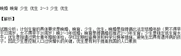 计划生育是我国的一项基本国策,它的基本方针是_________、_________、_________、_________。晚婚、晚育是指比法定时间晚_________年。_________是控制人口过快增长的关键;_________有利于提高人口素质。