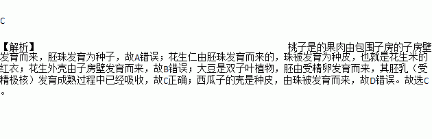 A. 桃子的果肉是由胚珠发育而成 B. 花生仁由子房发育而成