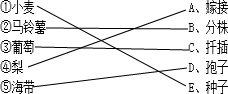解答:解:无性生殖指的是不需要经过两性生殖细胞的结合,由母体直接产生新个体的过程.常见的无性生殖的方式有扦插、嫁接、压条、分根等.葡萄适合用扦插,梨适合用嫁接,马铃薯适合用分株,海带适合孢子植物.