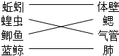 请将以下动物与其呼吸结构用直线连接: