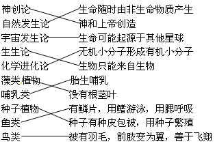 神创论 生命随时由非生命物质产生自然发生论 神和上帝创造宇宙发生论 生命可能起源于其他星球生生论 无机小分子形成有机小分子化学进化论 生物只能来自生物藻类植物 胎生哺乳哺乳类 没有根茎叶种子植物 有鳞片,用鳍游泳,用鳃呼吸鱼类 种子有种皮包被,用种子繁殖鸟类 被有羽毛,前肢变为翼,善于飞翔