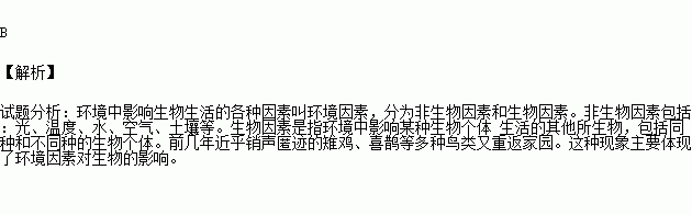 近几年,由于我市大力推广植树造林,不断扩大绿化面积,前几年几乎销声匿迹的雉鸡、喜鹊等多种鸟类又重返家园。这种现象主要体现了( )。