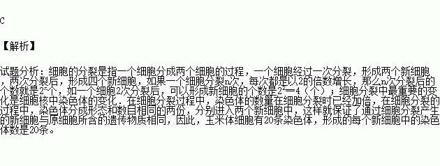 玉米体细胞有20条染色体,1个体细胞连续分裂2次后,形成的细胞数目和每个新细胞中的染色体数分别是( )