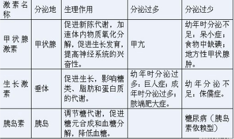 解:人体内主要内分泌腺的功能、激素的作用、分泌异常症如图所示:碘是合成甲状腺激素的原料,土壤、饮水、和食物中缺碘,会导致体内甲状腺激素合成的数量减少、造成甲状腺代偿性增生肿大而引起地方性甲状腺肿,食用加碘食盐可以预防.